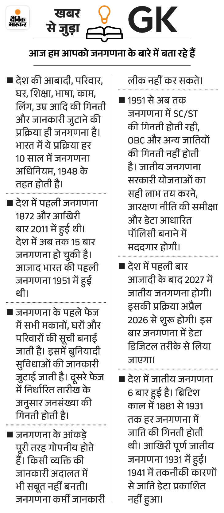 इससे पहले सरकार ने 22 जनवरी को जनगणना में पूछे जाने वाले सवालों की लिस्ट जारी की थी। सरकार ने बताया था कि इसमें मकान, परिवार, वाहन से जुड़े सवाल हैं। जनगणना के दौरान परिवार के मुखिया को ये जानकारियां देनी होंगी।