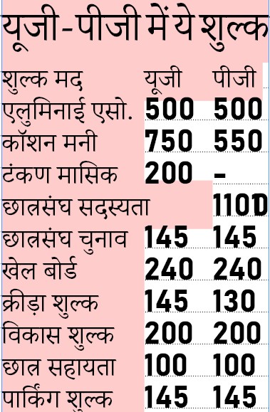 आरयू में नॉन कॉलेजिएट छात्रों से 1000 रुपए विमर्श शुल्क लेने के साथ ही रेगुलर छात्रों से भी 10 मदों में शुल्क वसूला जा रहा है, जिससे फीस में करीब 2 से 3 हजार रुपए की बढ़ोतरी हो जाती है। आरयू में इस सत्र से 500 रुपए एलुमिनाई एसोसिएशन फीस भी जोड़ी है। छात्रसंघ चुनाव नहीं होने के बावजूद हर 110 रुपए सदस्यता और 145 रुपए चुनाव शुल्क लिया जा रहा है। इसको लेकर मंगलवार को एनएसयूआई ने यूनिवर्सिटी गेट पर प्रदर्शन कर पुतला फूंका।