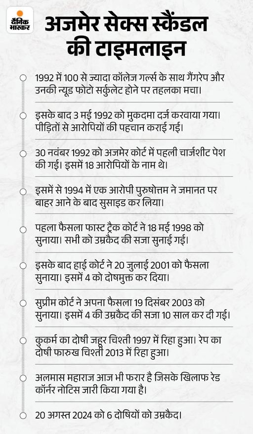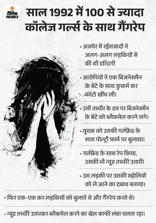 कांड के 32 साल बाद अगस्त 2024 में कोर्ट ने सुनाया था फैसला अजमेर फोटो ब्लैकमेलिंग कांड देशभर में चर्चित हुआ था। वर्ष 1992 में यह मामला सामने आया थाा। एक गिरोह ने कॉलेज और स्कूली छात्राओं को ब्लैकमेल कर 100 छात्राओं के साथ गैंगरेप किया था। उन्हें आपत्तिजनक फोटो से ब्लैकमेल किया गया था। एक स्टूडियो से आपत्तिजनक फोटो लीक होने के बाद यह मामला सामने आया था। मामले में उस समय 6 छात्राओं ने सुसाइड कर लिया था। इसका मुकदमा लंबा चला।
