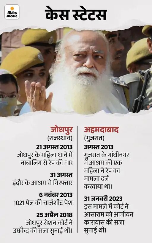 राजस्थान और गुजरात हाईकोर्ट से मिली थी राहत जोधपुर स्थित राजस्थान हाईकोर्ट ने 29 अक्टूबर को आसाराम को बढ़ती उम्र और लगातार गिरते स्वास्थ्य का हवाला देते हुए इलाज के लिए 6 महीने की अंतरिम जमानत दी थी।