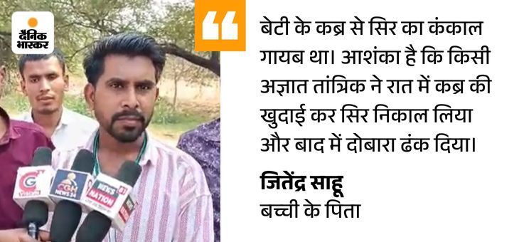परिवार अभी इस सदमे से पूरी तरह उबर भी नहीं पाया था कि अब बेटी की कब्र से छेड़छाड़ की घटना सामने आ गई। जितेंद्र साहू के अनुसार, कब्र से सिर का कंकाल गायब है। आशंका है कि किसी अज्ञात तांत्रिक ने रात में कब्र की खुदाई कर सिर निकाल लिया और बाद में दोबारा मिट्टी डालकर कब्र को ढंक दिया।