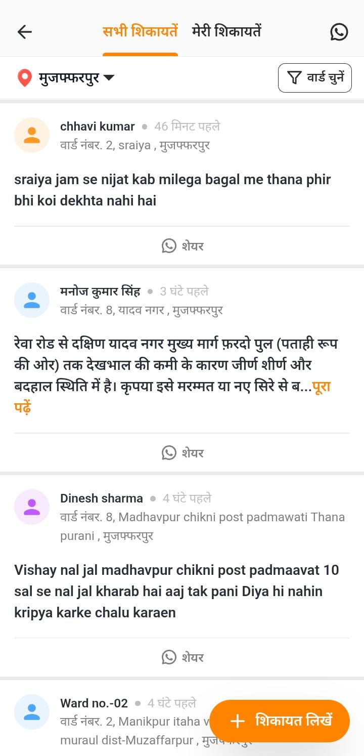- मुजफ्फरपुर शहर से जुड़ी समस्या भेजने के लिए इस लिंक पर क्लिक करें