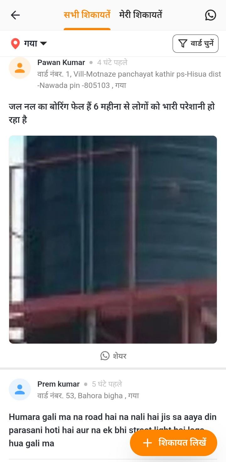 गया के ही पवन कुमार ने अपने क्षेत्र की नल योजना के संबंध में पोस्ट करते हुए लिखा कि हमारे क्षेत्र में नल जल का बोरिंग फेल है, 6 महीने से लोगों को परेशानी हो रही है। प्रेम कुमार ने बताया कि हमरे क्षेत्र में न रोड सही है और न ही नाली बनी है। जिस वजह से आने जाने मे समस्या होती है साथ ही गंदे पानी की उचित निकासी नहीं हो पाती है।