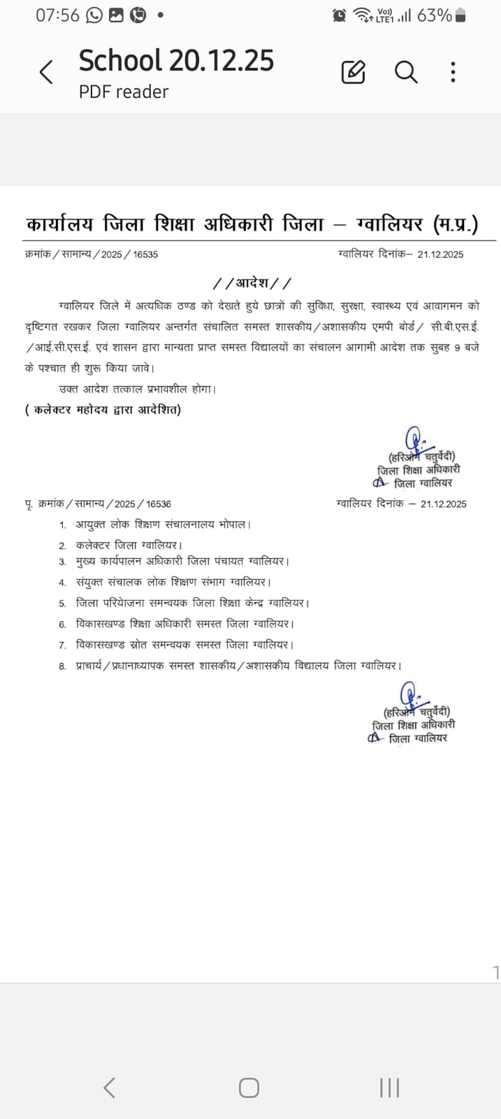 कड़ाके की सर्दी की वजह से ग्वालियर में स्कूल के समय में बदलाव