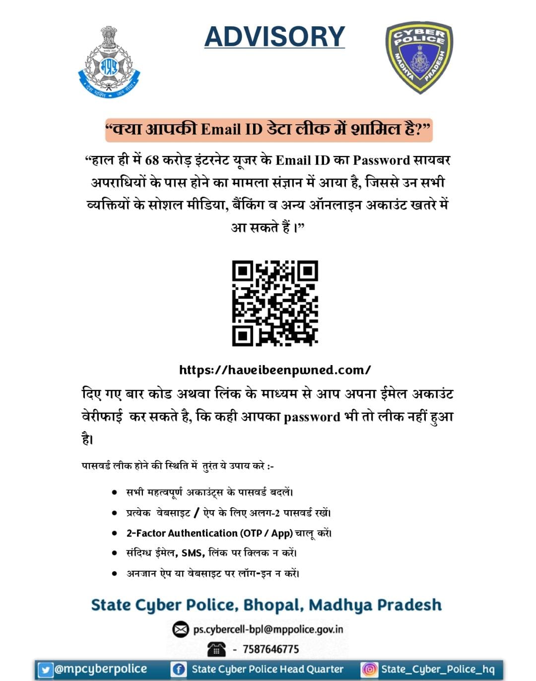 देश में 68 करोड़ ई-मेल आईडी-पासवर्ड लीक होने की खबर है. इससे सोशल मीडिया अकाउंट्स, वॉलेट, बैंकिंग सब खतरे में है. इसी को लेकर MP स्टेट साइबर ने गाइड लाइन जारी की है. मध्य प्रदेश स्टेट साइबर पुलिस ने लोगों को आगाह किया है.