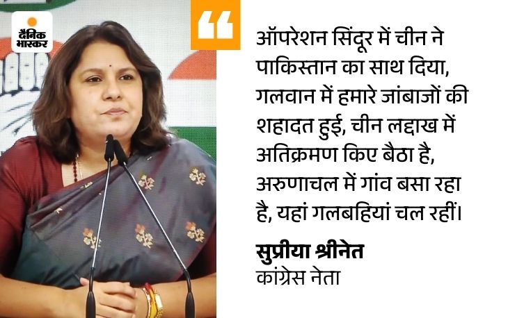 कांग्रेस नेता सुप्रिया श्रीनेत ने CPC-BJP बैठक की तस्वीर पोस्ट करते हुए लिखा- बीजेपी दफ्तर में बीजेपी नेता और CPC नेताओं के बीच मीटिंग हो रही है। BJP-चीन में कौन सा गुप्त समझौता हुआ? यह रिश्ता क्या कहलाता है? BJP ने देशद्रोह क्यों किया?