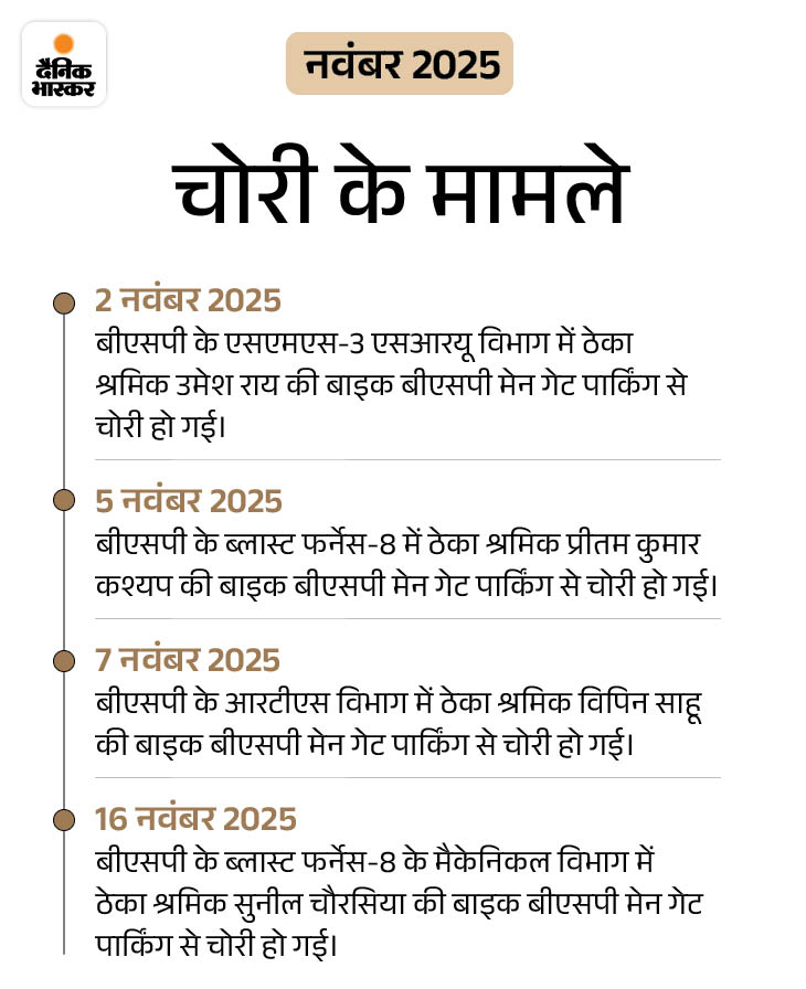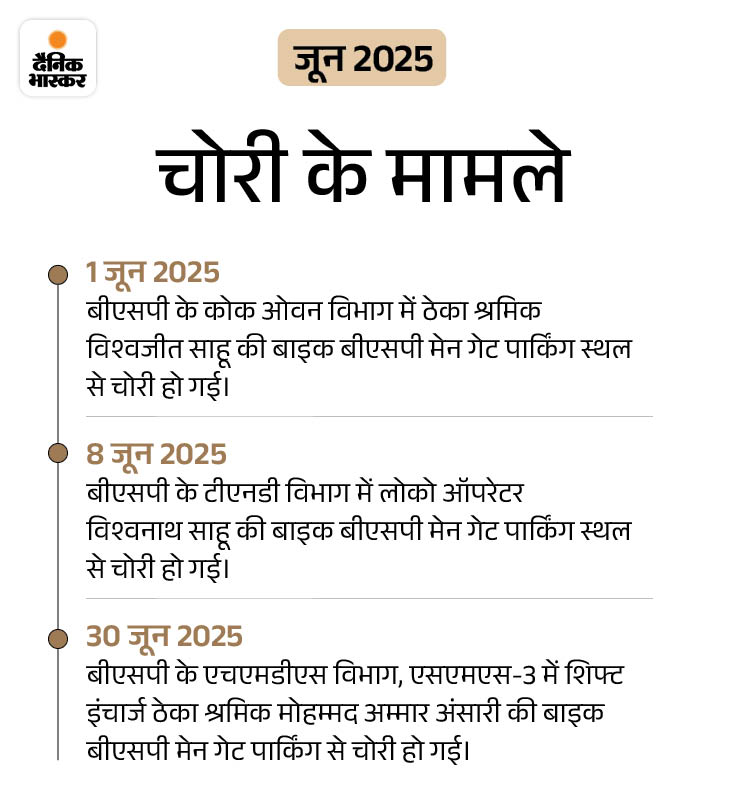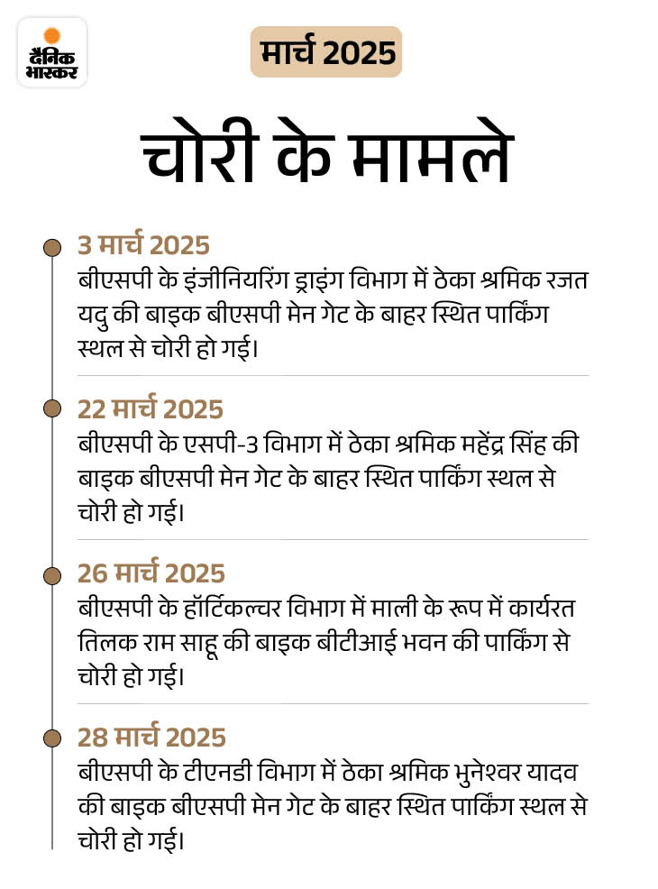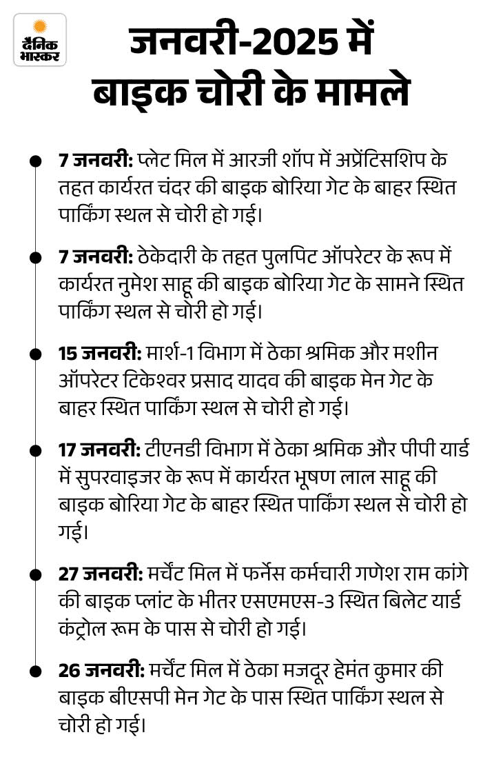 पुलिस रिकॉर्ड के अनुसार, 1 जनवरी से 14 दिसंबर 2025 के बीच 31 बाइक की चोरी हुई। इनमें सबसे ज्यादा 19 बाइक बीएसपी के मेन गेट के बाहर बनी पार्किंग से चोरी हुई हैं, जबकि 4 बाइक बीएसपी के बोरिया गेट की पार्किंग से गायब हुई।