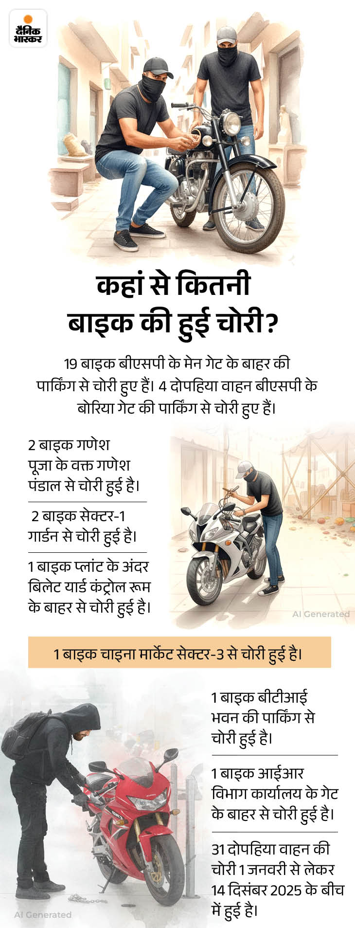 इसके अलावा गणेश पूजा के दौरान गणेश पंडाल से 2 बाइक चोरी हुईं। सेक्टर-1 गार्डन से भी 2 बाइक चोरी की घटनाएं दर्ज की गईं। वहीं, प्लांट के अंदर बिलेट यार्ड कंट्रोल रूम के बाहर से 1 बाइक, सेक्टर-3 के चाइना मार्केट से 1 बाइक चोरी हुई। बीटीआई भवन की पार्किंग से 1 बाइक और आईआर विभाग कार्यालय के गेट के बाहर से 1 बाइक चोरी हुई थी।