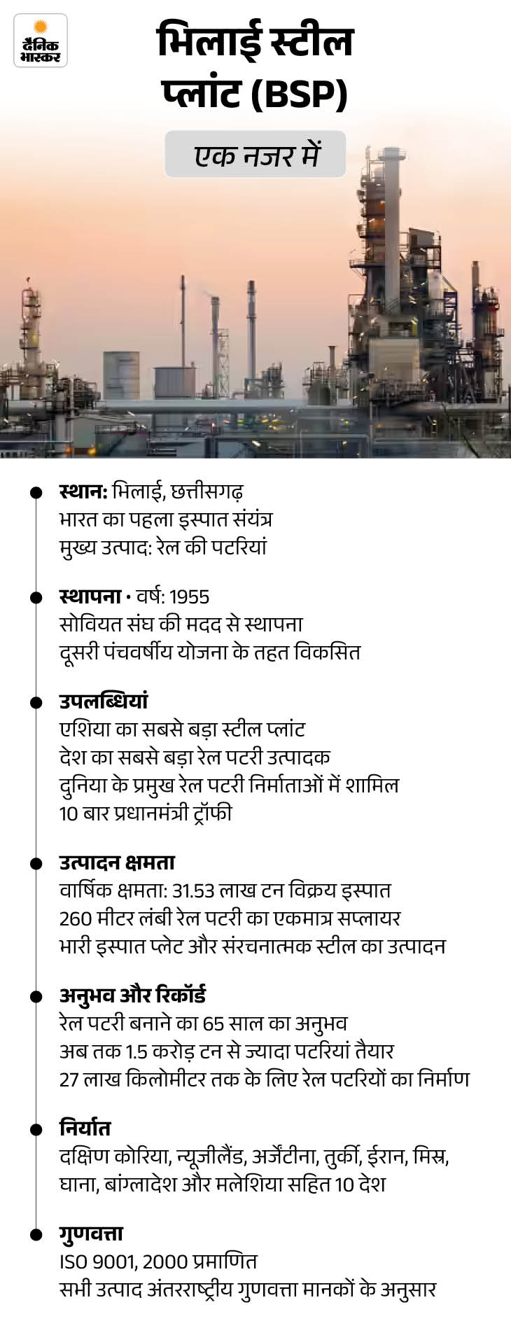 बता दें कि जम्मू-कश्मीर में चिनाब नदी पर बने दुनिया के सबसे ऊंचे रेलवे पुल के निर्माण में BSP का बड़ा योगदान है। एशिया महाद्वीप के सबसे बड़े कारखाने, भिलाई इस्पात संयंत्र सहित स्टील अथॉरिटी ऑफ इंडिया लिमिटेड (सेल) के इस्पात संयंत्रों ने 16,000 टन स्टील की आपूर्ति की है।