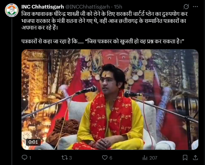 धीरेंद्र शास्त्री कहते हैं कि जिस पत्रकार को खुजली हो, वो सवाल पूछ सकता है। इसे कांग्रेस ने पत्रकारों का अपमान बताया है। कांग्रेस ने एक्स पर लिखा कि पत्रकार खुद से नहीं गए थे बल्कि भाजपा नेताओं ने उन्हें बुलाया था, फिर ऐसा अपमान क्यों ? यह सिर्फ बदतमीजी नहीं, बल्कि सत्ता के संरक्षण में पल रहा घमंड है।
