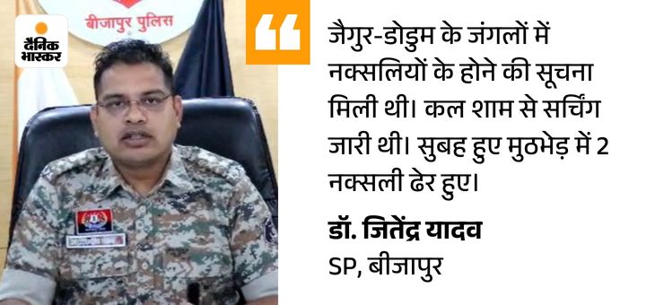 छत्तीसगढ़ के बीजापुर जिले में सुरक्षाबलों ने मुठभेड़ में दो वर्दीधारी नक्सलियों को मार गिराया। दोनों के शव बरामद कर लिए गए हैं। मौके से SLR और इंसास समेत अन्य हथियार भी जब्त किए गए हैं। एसपी डॉ. जितेंद्र यादव ने मुठभेड़ की पुष्टि की है।