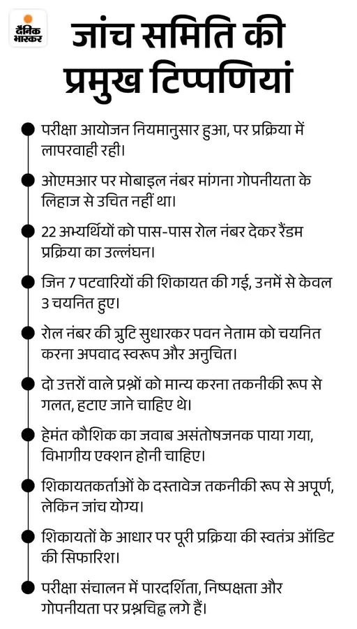 इसके बाद राजस्व पटवारी संघ के प्रदेश अध्यक्ष भागवत कश्यप ने परीक्षा में रिश्तेदारों के चयन और अन्य अनियमितताओं की शिकायत करते हुए उच्च स्तरीय जांच की मांग की। साथ ही संघ ने मंत्री को ज्ञापन सौंपा, विभाग ने एक जांच कमेटी गठित की, जिसने कुछ शिकायतों को सही और कुछ को निराधार माना।