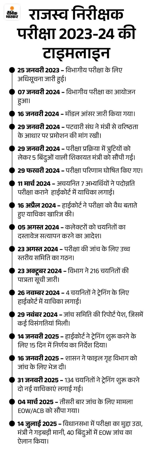 7 जनवरी 2024 राजस्व निरीक्षक के लिए विभागीय परीक्षा का आयोजन किया गया, जिसमें 2600 से ज्यादा पटवारियों ने हिस्सा लिया। 29 फरवरी 2024 को परीक्षा परिणाम घोषित किए गए, जिसमें 216 पटवारियों का चयन प्रशिक्षण के लिए हुआ।