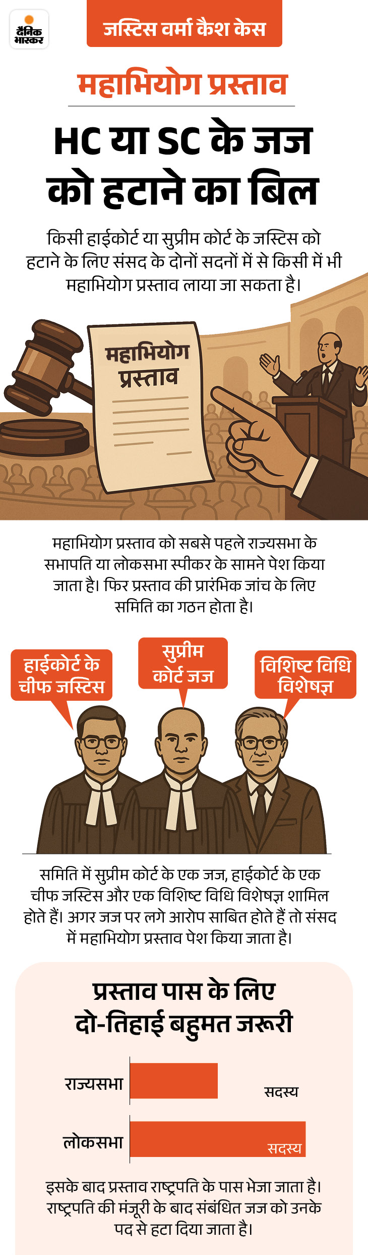 इसके बाद केंद्र सरकार ने संसद में जस्टिस वर्मा के खिलाफ महाभियोग प्रस्ताव पेश किया। संसद के 146 सदस्यों के प्रस्ताव को अध्यक्ष ने स्वीकार कर लिया।