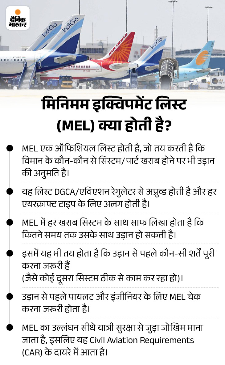 MEL यानी मिनिमम इक्विपमेंट लिस्ट वह लिस्ट होती है, जिसमें तय होता है कि किन तकनीकी खामियों के बावजूद विमान उड़ सकता है। DGCA के अनुसार इस केस में MEL की ‘O’ कंडीशन का पालन नहीं किया गया।