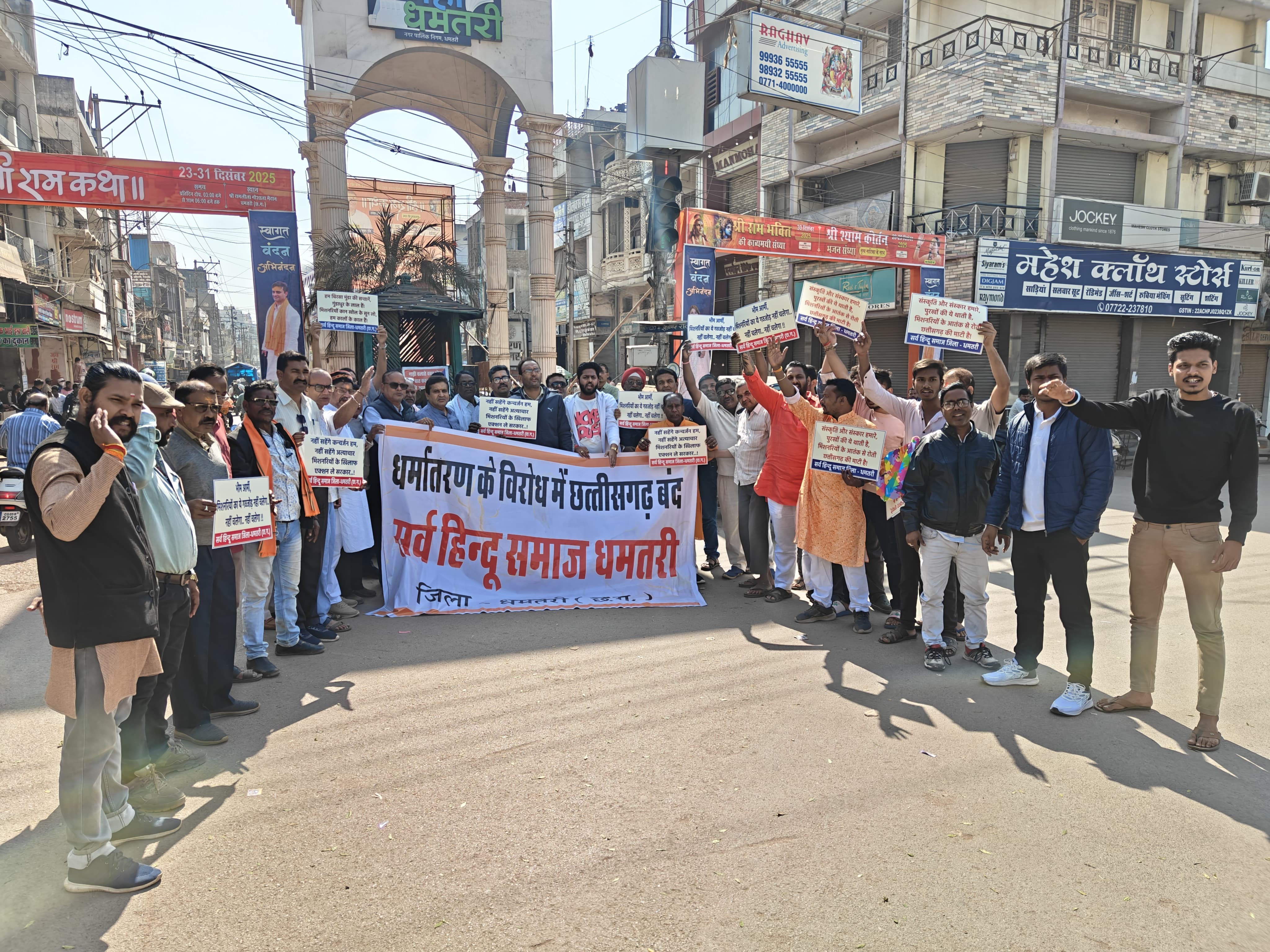 बंद के दौरान सर्व हिंदू समाज के पदाधिकारी और कार्यकर्ता घड़ी चौक पर एकत्रित हुए। यहां धर्मांतरण के खिलाफ जमकर नारेबाजी की गई, जिसमें ‘पूर्णता धर्मांतरण बंद होना चाहिए’ जैसे नारे लगाए गए।