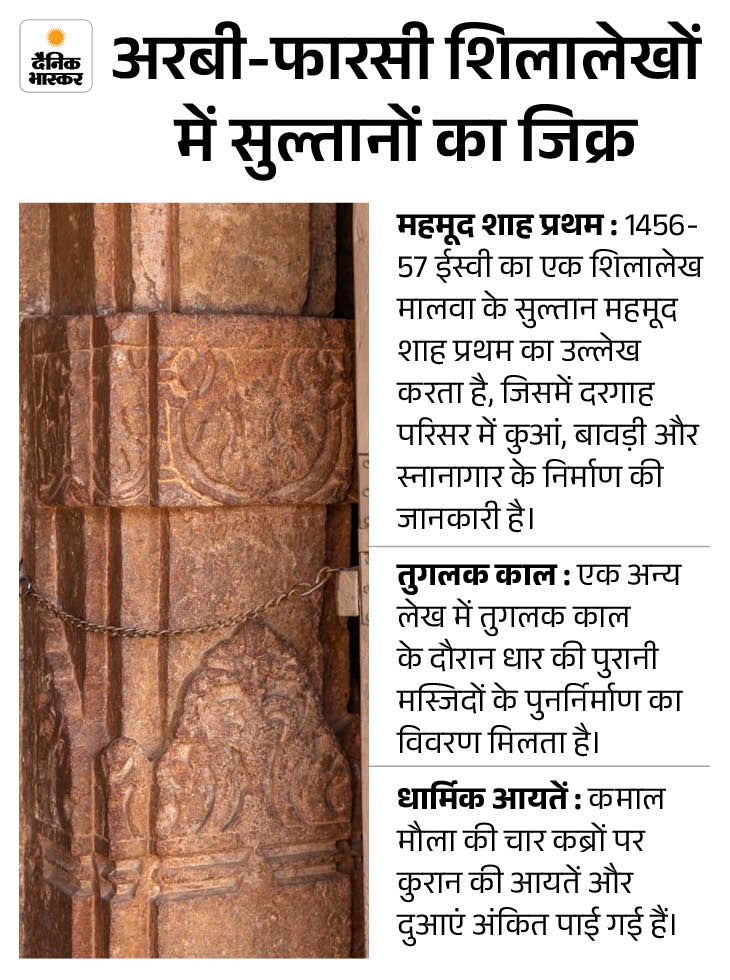 जांच में परिसर के भीतर 56 अरबी और फारसी शिलालेख भी पाए गए, जिनमें 43 स्याही से लिखे गए लेख शामिल हैं। इनमें आगंतुकों के अभिलेख, धार्मिक वाक्य, दुआएं और फारसी काव्य के शेर मिलते हैं।