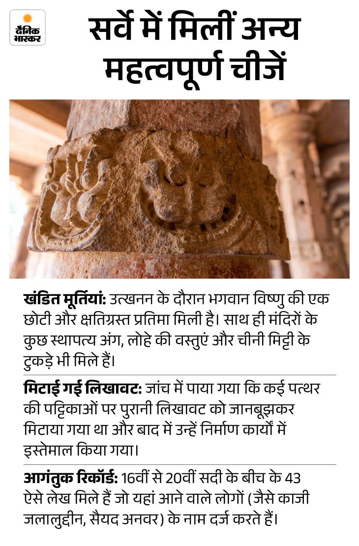 जांच के दौरान 13वीं सदी के आसपास के 50 शिलालेख खंड और प्रतिमा के आधार का एक टूटा हुआ टुकड़ा भी मिला। कई पट्टिकाओं पर लिखावट जानबूझकर मिटाई गई पाई गई, जिन्हें बाद में निर्माण कार्यों में इस्तेमाल किया गया।