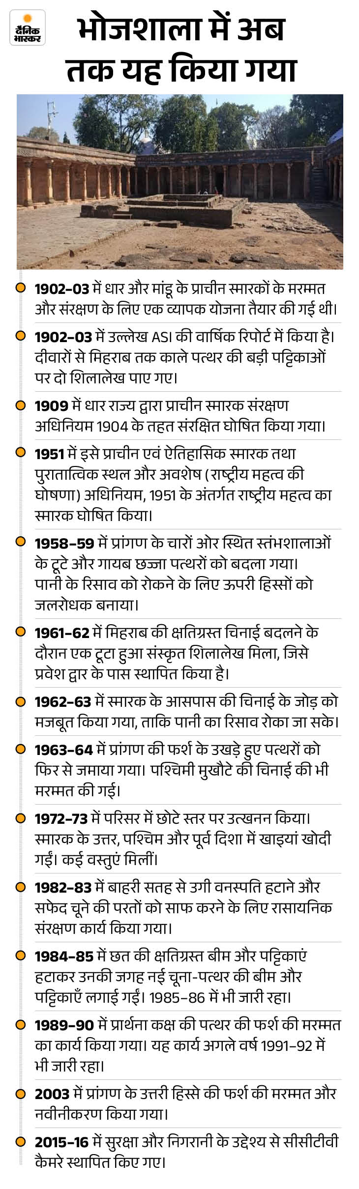 भोजशाला परिसर में 12वीं से 20वीं सदी तक के शिलालेखों के प्रमाण, संस्कृत-प्राकृत के साथ अरबी-फारसी लेख भी मिले हैं।