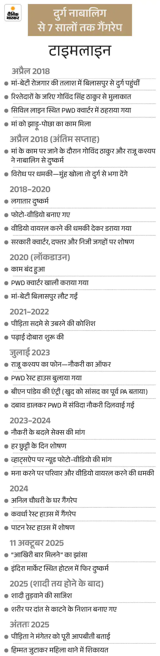 इसी दौरान अप्रैल 2018 के अंतिम सप्ताह में गोविंद ठाकुर और विभाग के ही एक कर्मचारी राजू कश्यप ने क्वार्टर में नाबालिग से बारी-बारी से दुष्कर्म किया। पीड़िता का आरोप है कि घटना के बाद उसे धमकाया गया कि अगर उसने किसी को बताया तो उसे दुर्ग से भगा दिया जाएगा।