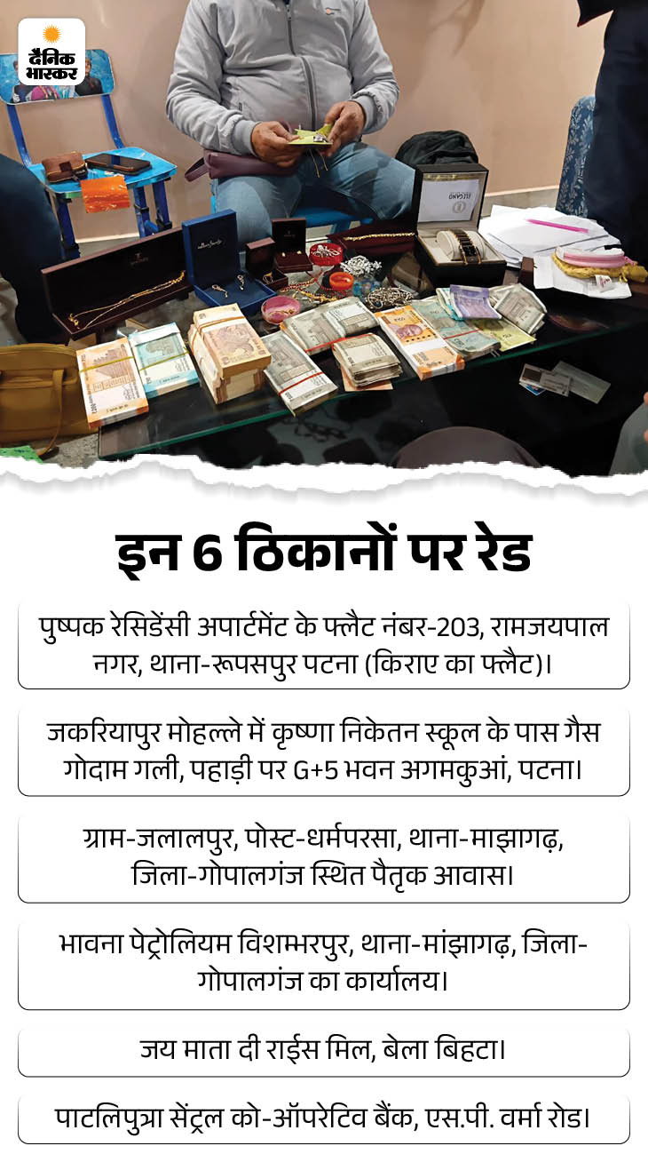 पटना के रामजयपाल नगर के पुष्पक रेसिडेंसी अपार्टमेंट में टीम ने रेड की है।