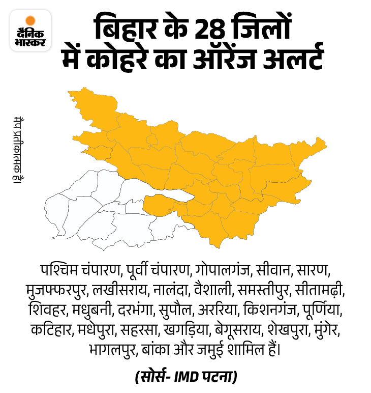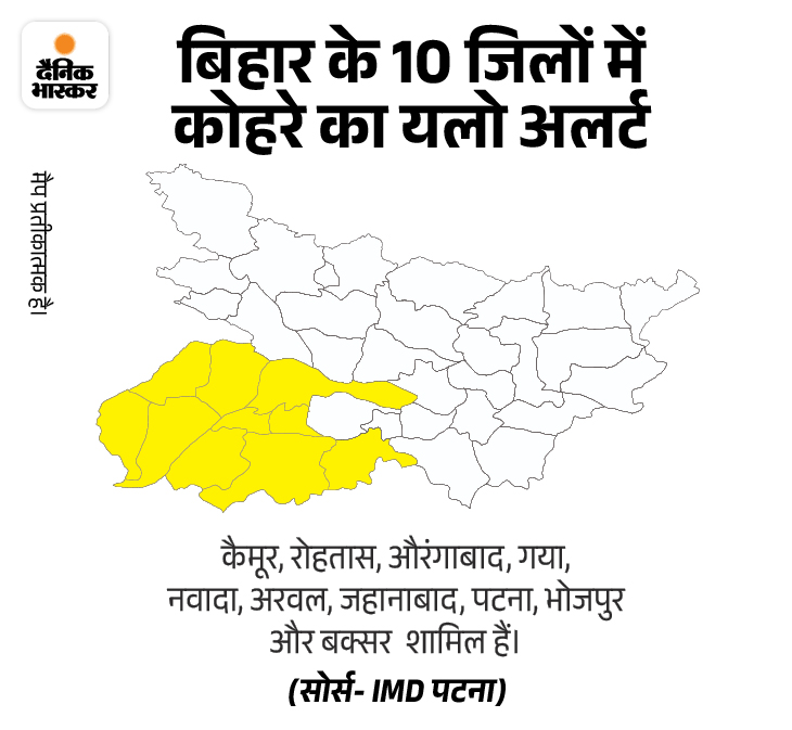 मौसम विज्ञान केंद्र ने बिहार के 10 जिलों में हल्के कोहरे का यलो अलर्ट जारी किया है। इन जिलों में कोहरा का असर थोड़ा कम दिखेगा। लेकिन ठंडी हवा के कारण कड़ाके की ठंड महसूस की जाएगी। वहीं, 28 जिलों में कोल्ड-डे और घने कोहरे का ऑरेंज अलर्ट जारी किया गया है। इस जिलों में कोहरे का असर ज्यादा दिखेगा।