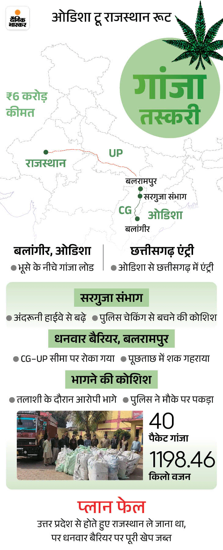नौ दिन पहले छत्तीसगढ़ के बलरामपुर जिले में भी पुलिस ने एक ट्रक से 6 करोड़ का गांजा जब्त किया था। गांजे को 3 तस्कर ओडिशा के बलांगीर जिले से छत्तीसगढ़ के रास्ते UP होते हुए 1700 किलोमीटर दूर राजस्थान ले जा रहे थे, लेकिन CG-UP बॉर्डर पर पकड़े गए।
