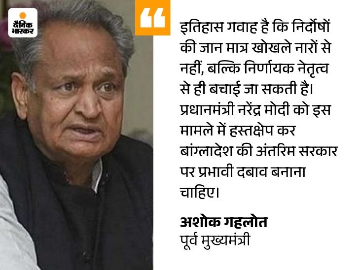गहलोत ने लिखा- यह भी चिंताजनक है कि ऐसा देश जिसका निर्माण ही भारत ने किया था वह भारत के खिलाफ हो गया है। यह भारत सरकार की कूटनीतिक विफलता है। केंद्र सरकार को गहरी चिंता व्यक्त करने जैसे रस्मी बयानों से आगे बढ़कर ठोस कदम उठाने चाहिए। पड़ोसी देश में अल्पसंख्यकों के जीवन और मान-सम्मान की रक्षा करना हमारी नैतिक और कूटनीतिक जिम्मेदारी है।