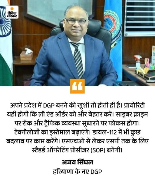नए DGP रेवाड़ी के, दिल्ली IIT से पास आउट हरियाणा के DGP बने अजय सिंघल का रेवाड़ी जिले से नाता है। उनके पूर्वज राजस्थान से हैं। करीब 300 साल पहले पूर्वज रेवाड़ी आकर बस गए थे। उनका गुजरात से भी नाता है। जहां उनके चाचा की फैक्ट्री है। सिंघल के पिता ओपी सिंघल मिलिट्री इंजीनियरिंग सर्विस में ऑफिसर रहे। सिंघल खुद दिल्ली IIT से मैकेनिकल इंजीनियरिंग में बीटेक हैं।