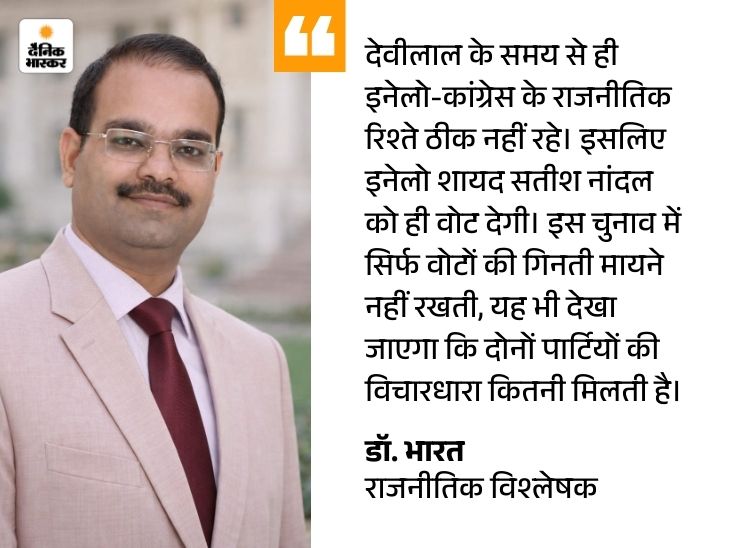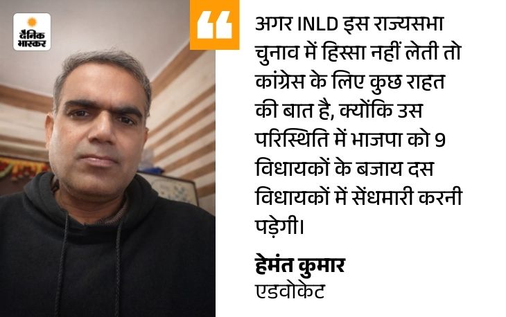 इनेलो के 2 विधायक हैं। अगर इतिहास देखें तो राज्यसभा चुनावों में इनेलो भाजपा के साथ ही गई है। हालांकि, इस बार जो निर्दलीय उम्मीदवार सतीश नांदल हैं, वे पहले इनेलो छोड़कर भाजपा में शामिल हुए थे। ऐसे में यह भी चर्चा है कि इनेलो के विधायक नांदल को वोट न दें या फिर चुनाव से दूरी बना लें।