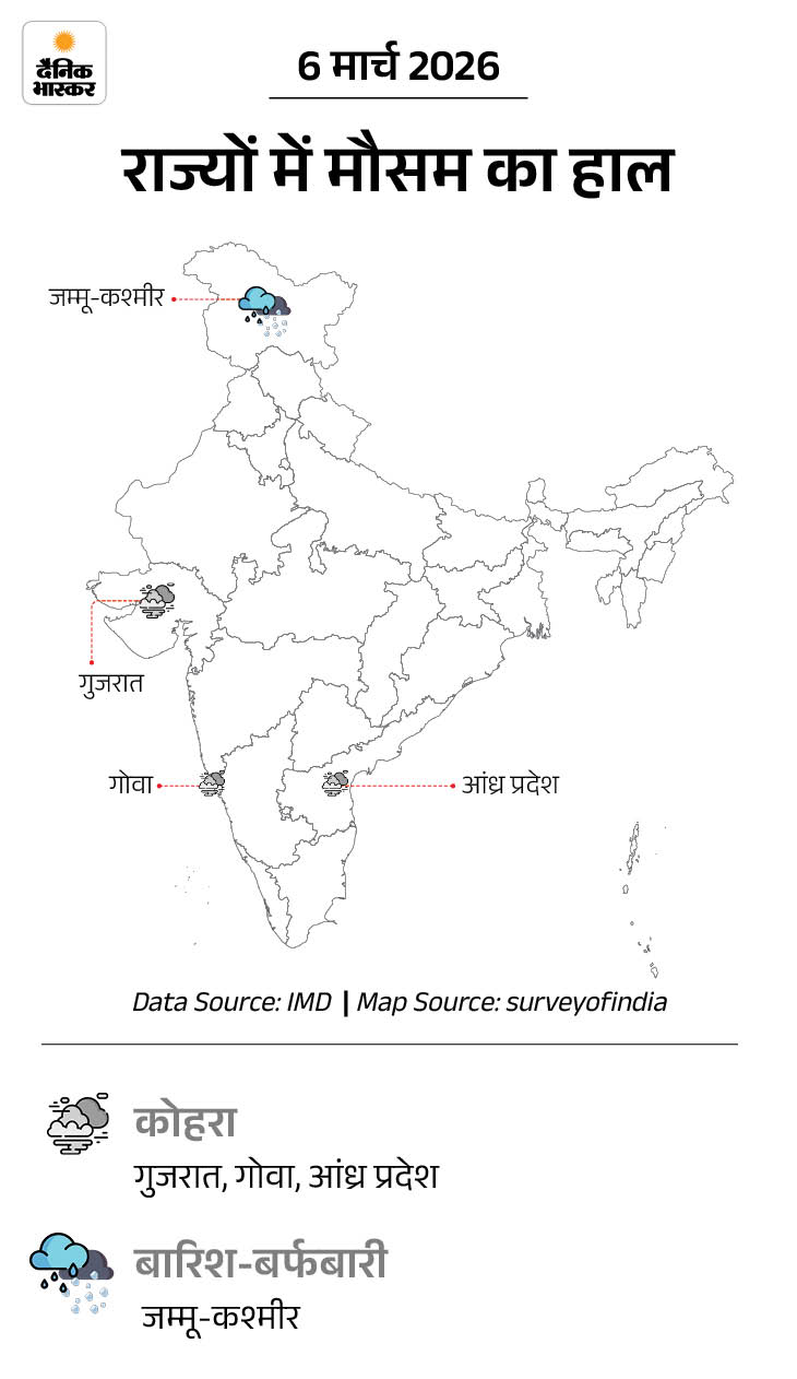 7-8 मार्च- जम्मू-कश्मीर, लद्दाख, हिमाचल प्रदेश और उत्तराखंड में बारिश-बर्फबारी की संभावना। पश्चिम बंगाल, सिक्किम और ओडिशा में हल्की बारिश के आसार हैं।