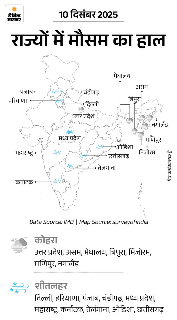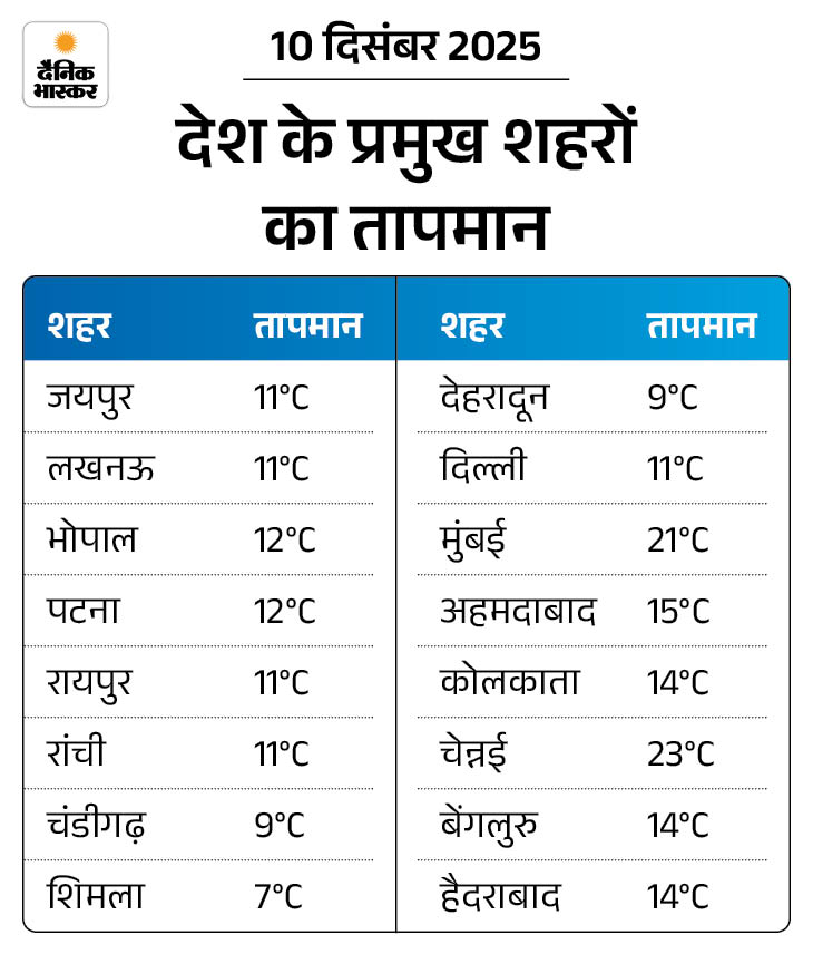 पहाड़ी राज्यों में बर्फबारी के बीच मैदानी इलाकों में सर्दी बढ़ने लगी है। मध्य प्रदेश में अगले 2 दिन शीतलहर का अलर्ट है। वहीं राजस्थान में 10 दिसंबर तक कोल्ड वेव का असर रहेगा।