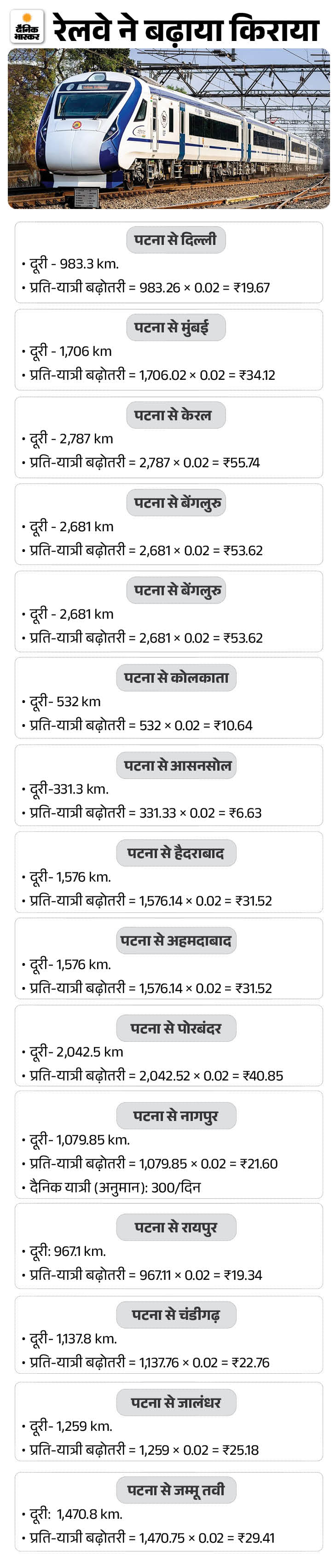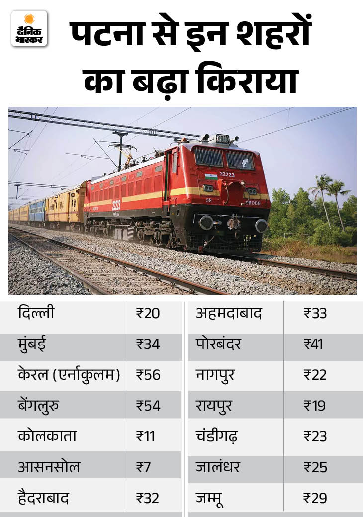दिल्ली से पटना की दूरी करीब 1000 KM है। यानी दिल्ली के लिए 20 रुपए अधिक देने होंगे। वहीं, मुंबई के लिए 34.12 रुपए, बेंगलुरु के लिए 53.62 रुपए, केरल के लिए 55 रुपए अधिक देने होंगे। हालांकि, जनरल कोच के लिए किराया नहीं बढ़ाया है।
