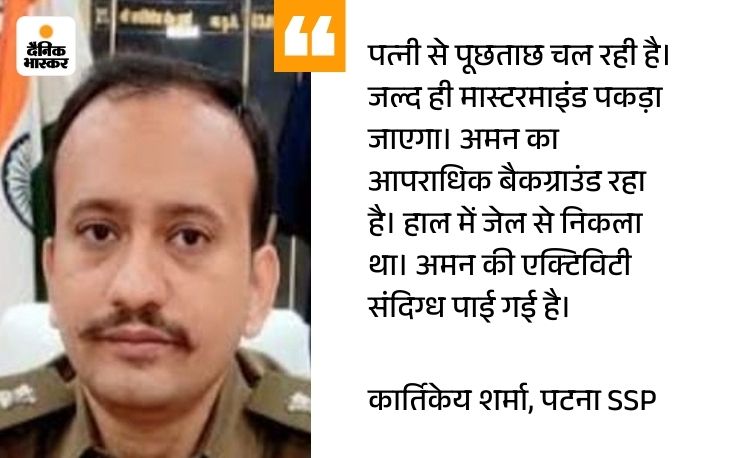 पटना SSP कार्तिकेय शर्मा ने बताया था- हत्या के मास्टरमाइंड की पहचान हो गई है। पुरानी रंजिश और प्रेम प्रसंग दोनों मामला निकलकर सामने आया है। इस दोनों एंगल पर काम चल रहा है। मृतक के मोबाइल से भी बहुत सारी जानकारी मिली है। फिलहाल उसकी पत्नी से पूछताछ हो रही है। पिछले 3 दिनों से अमन शुक्ला अपने घर नहीं जा रहा था। बोरिंग रोड में किसी फ्लैट में ठहरा था।