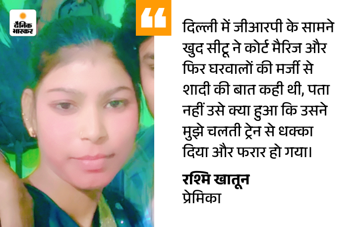 रश्मि ने बताया कि मैं अपनी मां और सीटू के साथ 11 की शाम को दिल्ली से भागलपुर के लिए ट्रेन में बैठ गई। इससे पहले मेरे प्रेमी सीटू ने जीआरपी के सामने वादा किया कि भागलपुर पहुंचने के बाद सबसे पहले तुम्हारे साथ कोर्ट मैरिज करूंगा। हम तीनों ट्रेन से भागलपुर आने के लिए ट्रेन में बैठे थे। रास्ते भर बातचीत करते आए। 12 दिसंबर को सबौर रेलवे स्टेशन के पास मोबाइल को लेकर हम दोनों के बीच विवाद हुआ। इसी दौरान, सीटू ने मुझे चलती ट्रेन से धक्का दे दिया और खुद भी कूद गया।
