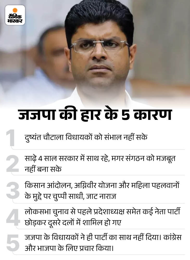 विधानसभा चुनाव 2024 में जजपा हीरो से जीरो बनी 2019 के विधानसभा चुनाव में भाजपा के साथ मिलकर सरकार बनाने वाली जजपा 2024 में आजाद समाज पार्टी (ASP) के साथ मिलकर 85 सीटों पर लड़ी। राज्य में पार्टी को कुल 1.25 लाख वोट ही मिले। 2019 में उचाना में रिकॉर्ड वोटों से जीतने वाले दुष्यंत चौटाला इस बार पांचवें स्थान पर खिसक गए। उन्हें 7950 वोट ही मिले थे। सिर्फ डबवाली में उनके भाई दिग्विजय चौटाला की जमानत बच पाई। दिग्विजय को यहां 35,261 वोट मिले। इसके अलावा प्रदेश में अधिकतर सीटों पर जजपा की जमानत जब्त हो गई थी।
