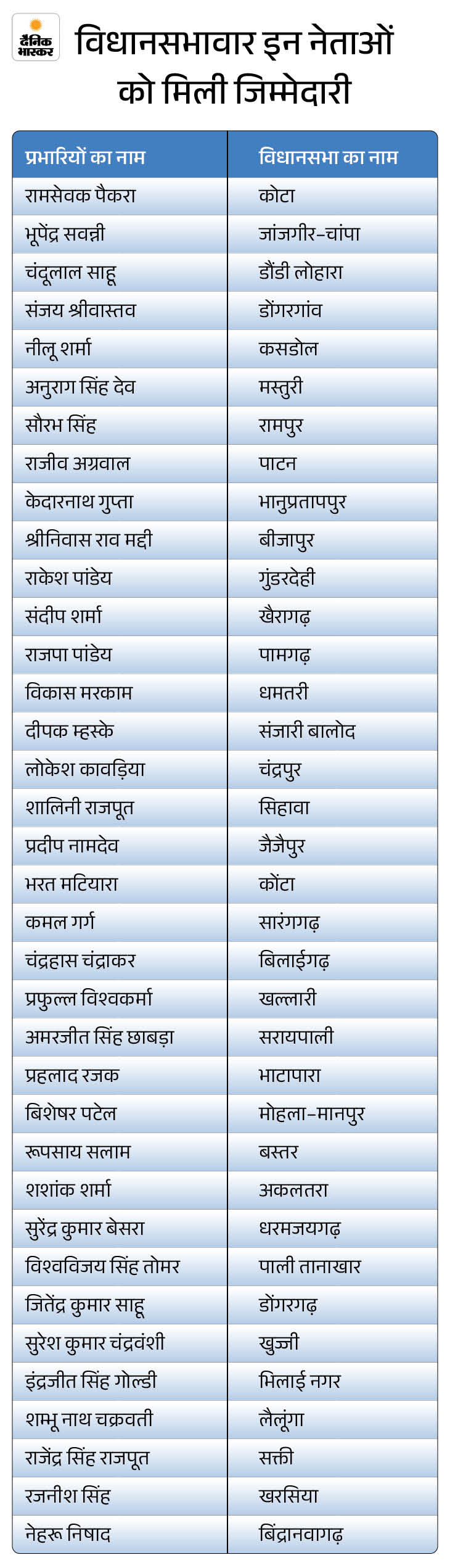 वहीं निगम मंडल में अध्यक्ष की कमान संभाल रहे भूपेंद्र सवन्नी, केदारनाथ गुप्ता और संजय श्रीवास्तव का संगठन में कद बढ़ाया गया है। पार्टी ने भूपेंद्र को जांजगीर-चांपा विधानसभा, केदारनाथ गुप्ता भानुप्रतापपुर और संजय श्रीवास्तव डोंगरगांव विधानसभा प्रभारी की जिम्मेदारी सौंपी है।
