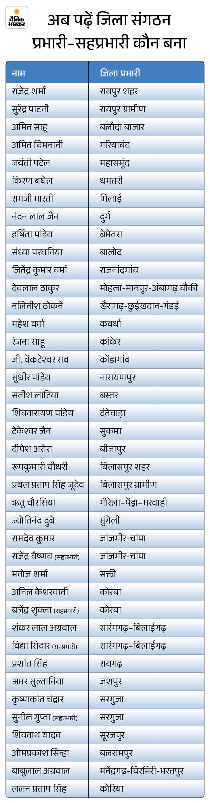 वहीं जिला संगठन की बात करें तो प्रभारी और सह प्रभारियों की भी नियुक्तियां की गई हैं। इनमें रायपुर शहर की जिम्मेदारी राजेंद्र शर्मा और रायपुर ग्रामीण की कमान सुरेंद्र पाटनी को दी गई है। वहीं बिलासपुर ग्रामीण की जिम्मेदारी प्रबल प्रताप जूदेव को सौंपी गई है।