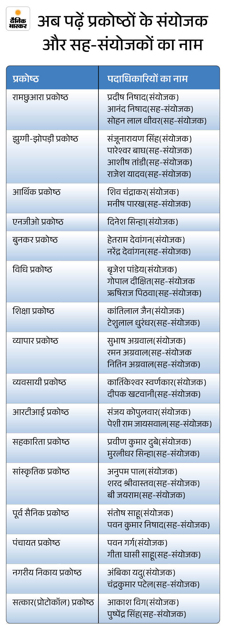 इसके साथ ही प्रकोष्ठों में संयोजक और सह-संयोजकों की भी नियुक्तियां की गई हैं, जिनमें मछुआरा प्रकोष्ठ, झुग्गी-झोपड़ी प्रकोष्ठ, आर्थिक प्रकोष्ठ, एनजीओ प्रकोष्ठ और बुनकर प्रकोष्ठ समेत अलग प्रकोष्ठ शामिल हैं।