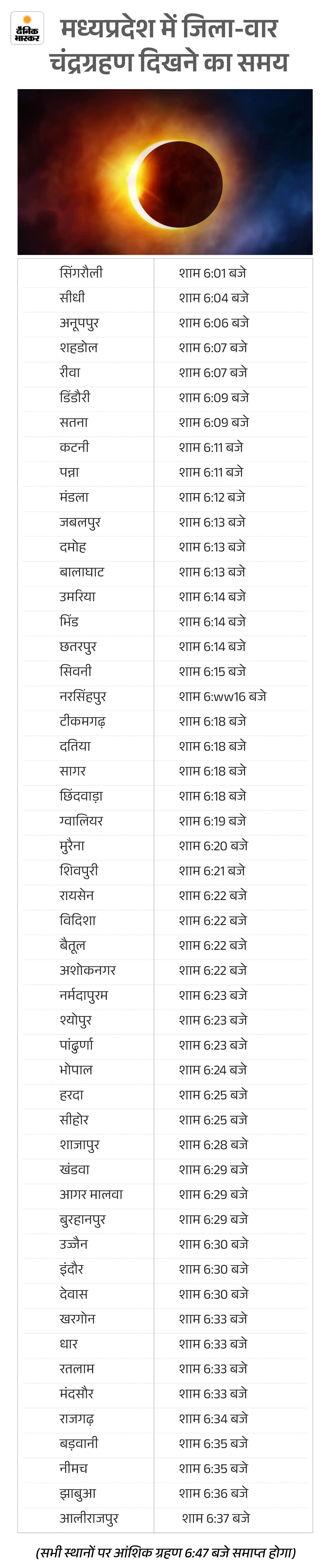 खगोलीय गणना के अनुसार आंशिक ग्रहण दोपहर 3 बजकर 20 मिनट 07 सेकंड से आरंभ होगा। पूर्णग्रहण 4 बजकर 34 मिनट 34 सेकंड पर शुरू होकर 5 बजकर 32 मिनट 49 सेकंड पर समाप्त हो जाएगा। आंशिक ग्रहण की समाप्ति शाम 6 बजकर 47 मिनट 15 सेकंड पर होगी। चूंकि भारत में चंद्रोदय शाम को होगा, इसलिए यहां केवल अंतिम आंशिक चरण ही दिखाई देगा। जिन जिलों में चंद्रोदय पहले होगा, वहां ग्रहण अधिक देर तक दिखेगा, जबकि पश्चिमी जिलों में अवधि कम रहेगी।