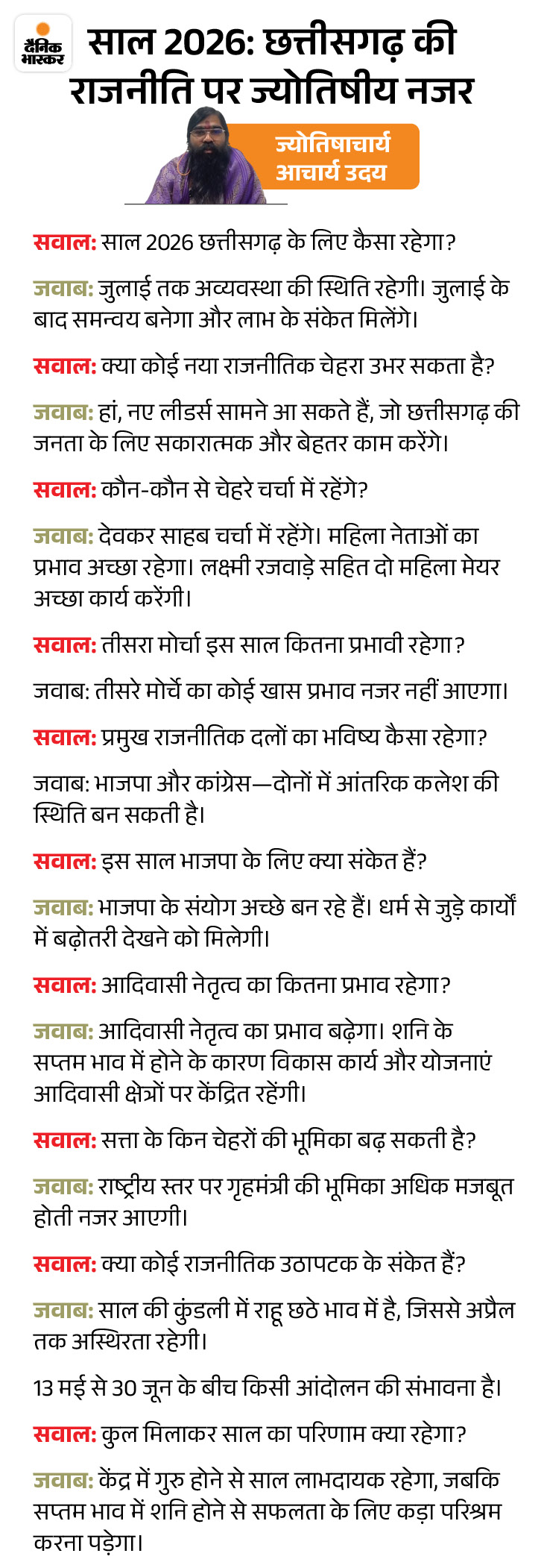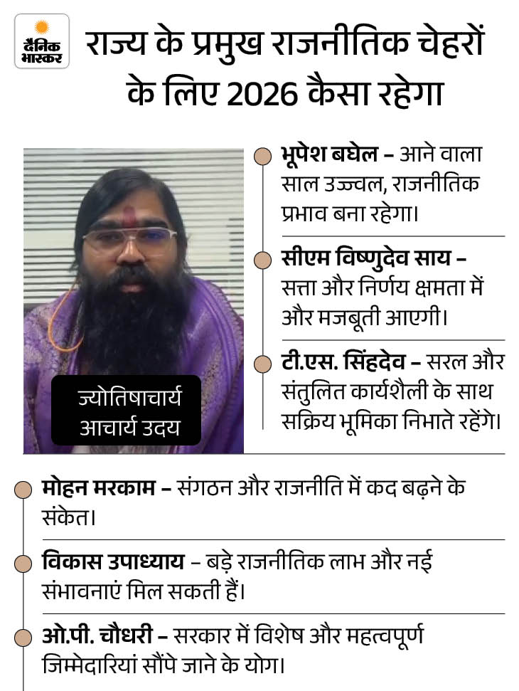 साल 2026 छत्तीसगढ़ की राजनीति के लिए निर्णायक साबित हो सकता है। ज्योतिषाचार्य आचार्य उदय के अनुसार आने वाला साल सत्ता, संगठन और सड़कों-तीनों स्तरों पर हलचल लेकर आएगा। ग्रहों की चाल यह संकेत दे रही है कि वर्ष की शुरुआत में राजनीतिक और प्रशासनिक अव्यवस