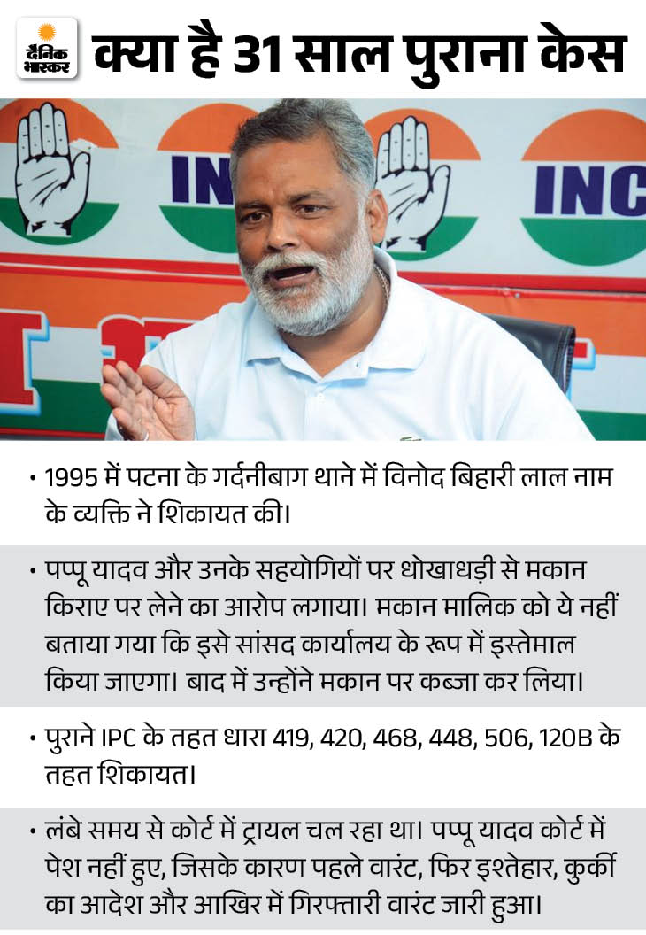 जानकारी के मुताबिक, पप्पू यादव NEET छात्रा मामले में दिल्ली के जंतर-मंतर पर प्रदर्शन करने वाले थे। इससे पहले शुक्रवार देर रात उन्हें 31 साल पुराने केस में गिरफ्तार कर लिया गया।