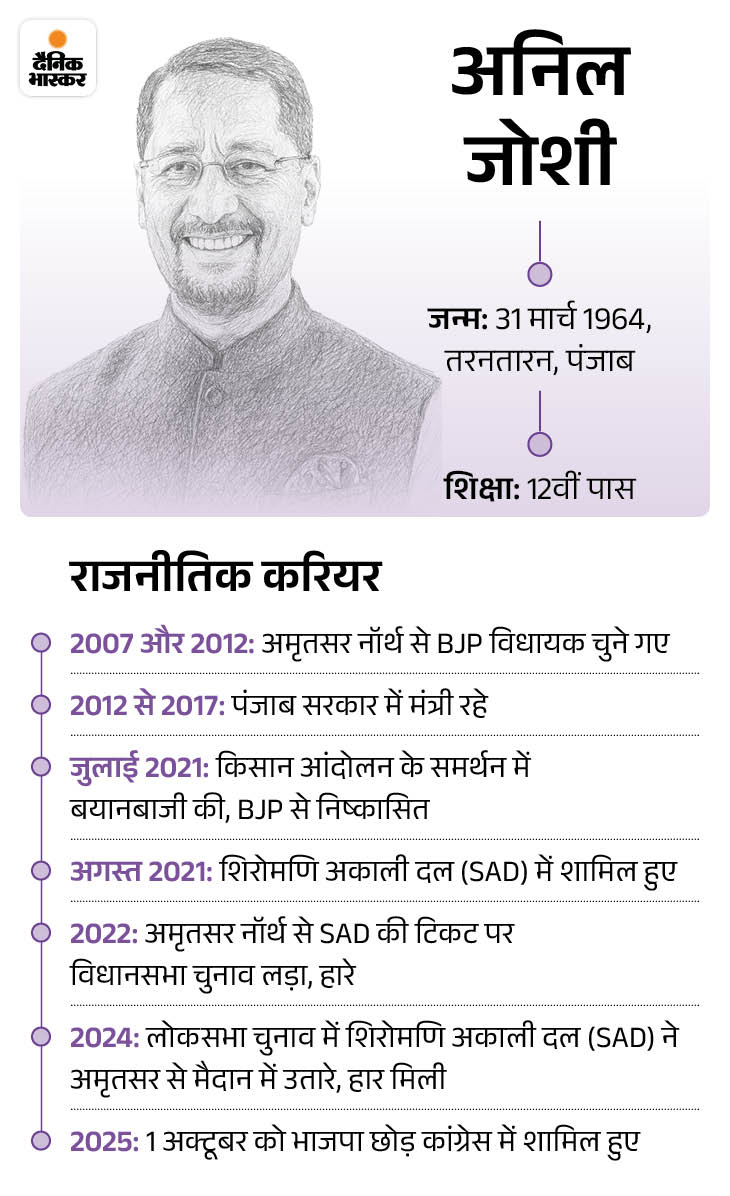 भाजपा से SAD में आए थे जोशी अनिल जोशी पहले भाजपा में थे। 2007 और 2012 के विधानसभा चुनाव में अमृतसर नॉर्थ सीट से BJP के टिकट पर लगातार दो बार चुनाव जीतकर वह विधानसभा में पहुंचे। उस समय पंजाब में अकाली दल और BJP गठबंधन की सरकार थी, जिसमें अनिल जोशी मंत्री भी बने।