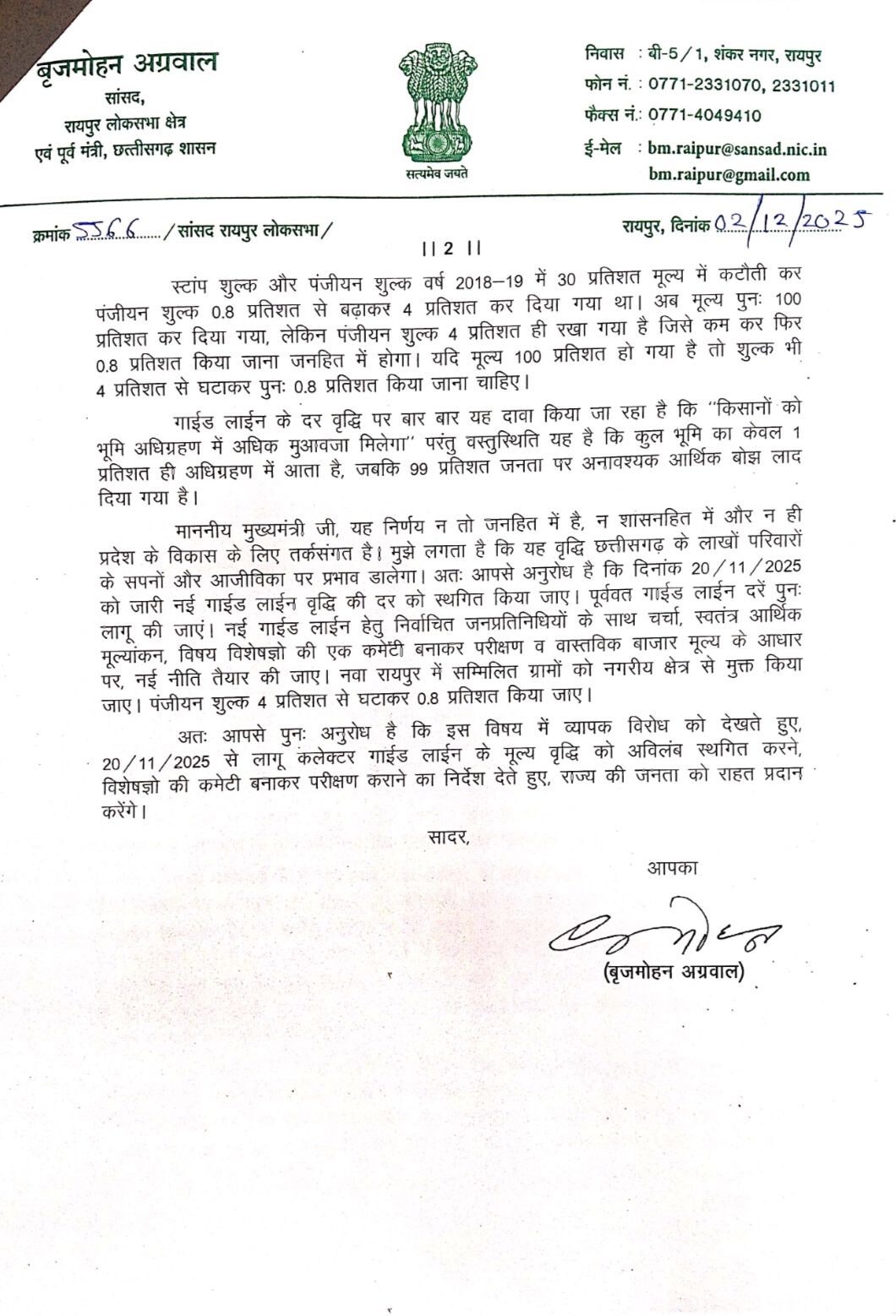 सांसद बृजमोहन अग्रवाल का कहना है कि लोकतंत्र में जनभावनाओं का सम्मान सबसे महत्वपूर्ण है. उन्होंने कहा कि जनता पर कोई अतिरिक्त आर्थिक बोझ नहीं डाला जाना चाहिए. इसी दृष्टि से उन्होंने मुख्यमंत्री को पत्र में स्पष्ट रूप से अनुरोध किया है कि गाइडलाइन दरों में की गई 100 से 800 प्रतिशत तक की वृद्धि को तत्काल प्रभाव से रोका जाए और इस पर पुनर्विचार किया जाए.सांसद ने पत्र में लिखा कि इस तरह की वृद्धि सीधे आम जनता की जेब पर असर डालती है और इसके कारण लोगों में असंतोष पैदा हो सकता है. उन्होंने कहा कि सरकार को यह सुनिश्चित करना चाहिए कि निर्णय जनहित और समाज के आर्थिक स्थायित्व के अनुकूल हों.