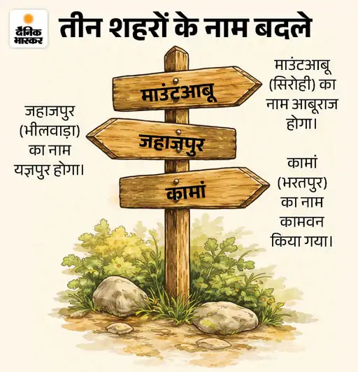 जवाब : केंद्र सरकार हो या राज्यों की बीजेपी सरकार। शहरों का नाम बदलना उनके एजेंडे में शामिल है। ऐसा ही राजस्थान में भी सीएम भजनलाल ने किया। उन्होंने तीन शहरों के नाम बदले। बीजेपी का तर्क है कि आक्रांताओं ने या अन्य कारणों से पहले जो नाम बदले गए, उन्हें वापस ठीक कर रहे हैं। सीएम ने माउंटआबू का नाम आबूराज, जहाजपुर का नाम यज्ञपुर, कामां का नाम कामवन करने का ऐलान किया।