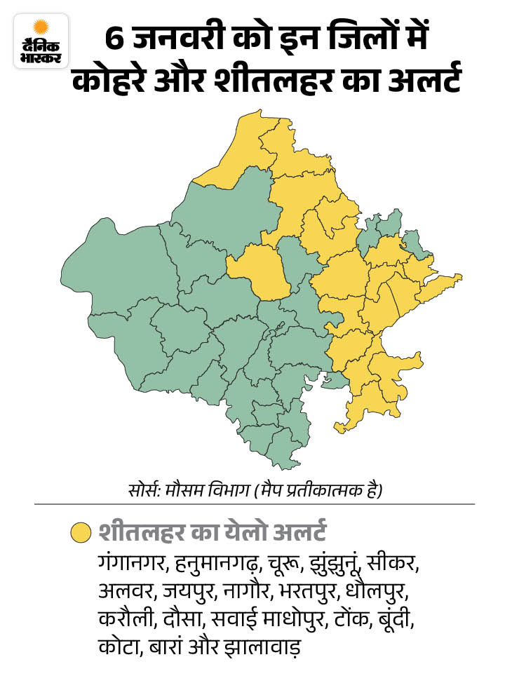 वहीं, मौसम विभाग ने आज 18 जिलों में कोहरे और शीतलहर का अलर्ट जारी किया है। मंगलवार सुबह राजधानी जयपुर में कोहरे के कारण विजिबिलिटी 0 मीटर रही।
