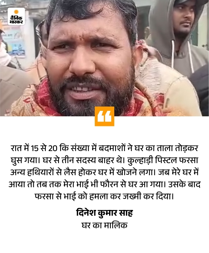 घर के मालिक दिनेश कुमार साह दिनकर ने बताया कि रात में 15 से 20 कि संख्या में बदमाशों ने घर का ताला तोड़कर घुस गया। घर से तीन सदस्य बाहर थे। कुल्हाड़ी पिस्टल फरसा अन्य हथियारों से लैस होकर घर में खोजने लगा। जब मेरे घर में आया तो तब तक मेरा भाई भी फौरन से घर आ गया। उसके बाद फरसा से भाई को हमला कर जख्मी कर दिया। अपराधी 42 हजार रुपए नगद के साथ-साथ उनकी पत्नी और बेटी की शादी के लिए रखे गए गहने-जेवर व अन्य कीमती सामान लूटकर फरार हो गए।