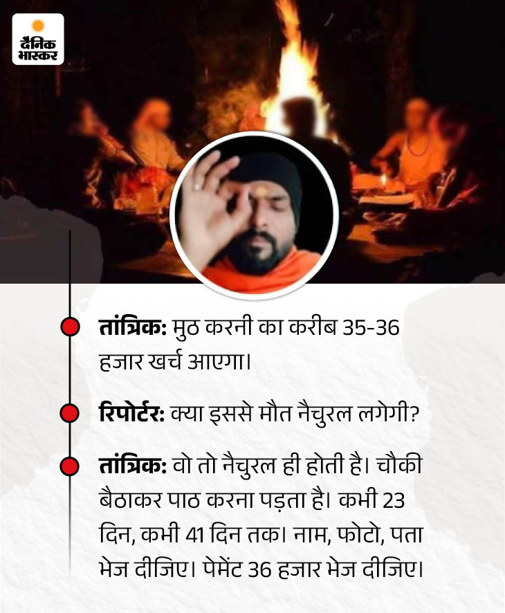 यह भास्कर रिपोर्टर और खुद को नागा साधु बताने वाले एक तांत्रिक के बीच हुई बातचीत का हिस्सा है। यह तांत्रिक दावा कर रहा था कि वह तंत्र-मंत्र के जरिए न केवल खोया हुआ प्यार वापस ला सकता है, बल्कि अगर रिश्ते में कोई बाधा है, तो उसे “मारण क्रिया” से हमेशा के लिए खत्म भी कर सकता है।