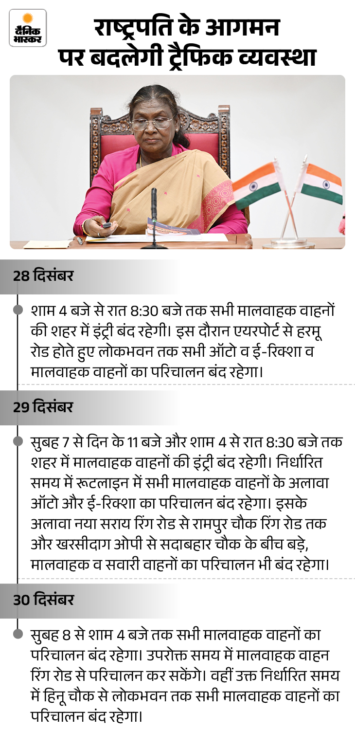 28 दिसंबर को शाम 4 बजे से रात 8.30 बजे तक शहर में सभी मालवाहक वाहनों की एंट्री बंद रहेगी। इस दौरान एयरपोर्ट से हरमू रोड होते हुए लोकभवन तक ऑटो, ई-रिक्शा और मालवाहक वाहनों का परिचालन पूरी तरह बंद रहेगा। 29 दिसंबर को सुबह 7 से 11 बजे और शाम 4 से रात 8.30 बजे तक मालवाहक वाहनों की एंट्री बंद रहेगी।