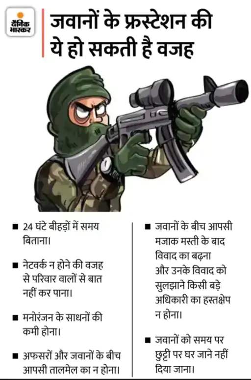 वहीं, 4 महीने पहले सुकमा में बिहार के रहने वाले CRPF के जवान ने ड्यूटी के दौरान उसने अपनी सर्विस राइफल खुद को शूट कर लिया था। वह छुट्टी से कैंप लौटा था। आरक्षक शशि भूषण कुमार (31) ने शिविर में संतरी की ड्यूटी के दौरान लाइट मशीन गन (LMG) से खुद को गोली मारी थी। पढ़ें पूरी खबर…